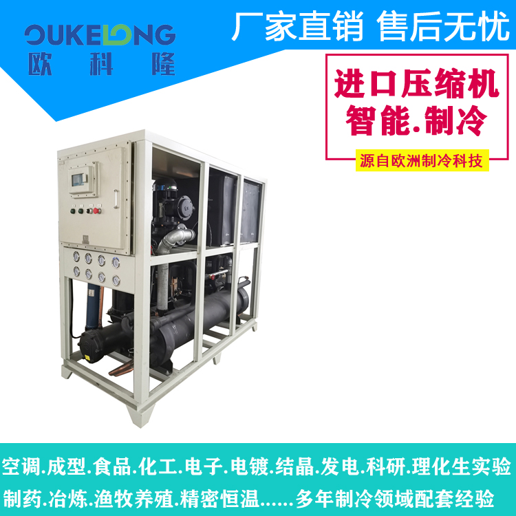 歐科隆水冷箱式防爆冷水機(jī)組專為石油化工、制藥、鋰電池生產(chǎn)等易燃易爆環(huán)境設(shè)計(jì),通過(guò)國(guó)家Ex dⅡBT4防爆認(rèn)證,整機(jī)采用防爆結(jié)構(gòu)及無(wú)火花元件,確保在危險(xiǎn)場(chǎng)所安全穩(wěn)定運(yùn)行,為關(guān)鍵工藝提供可靠制冷保障。